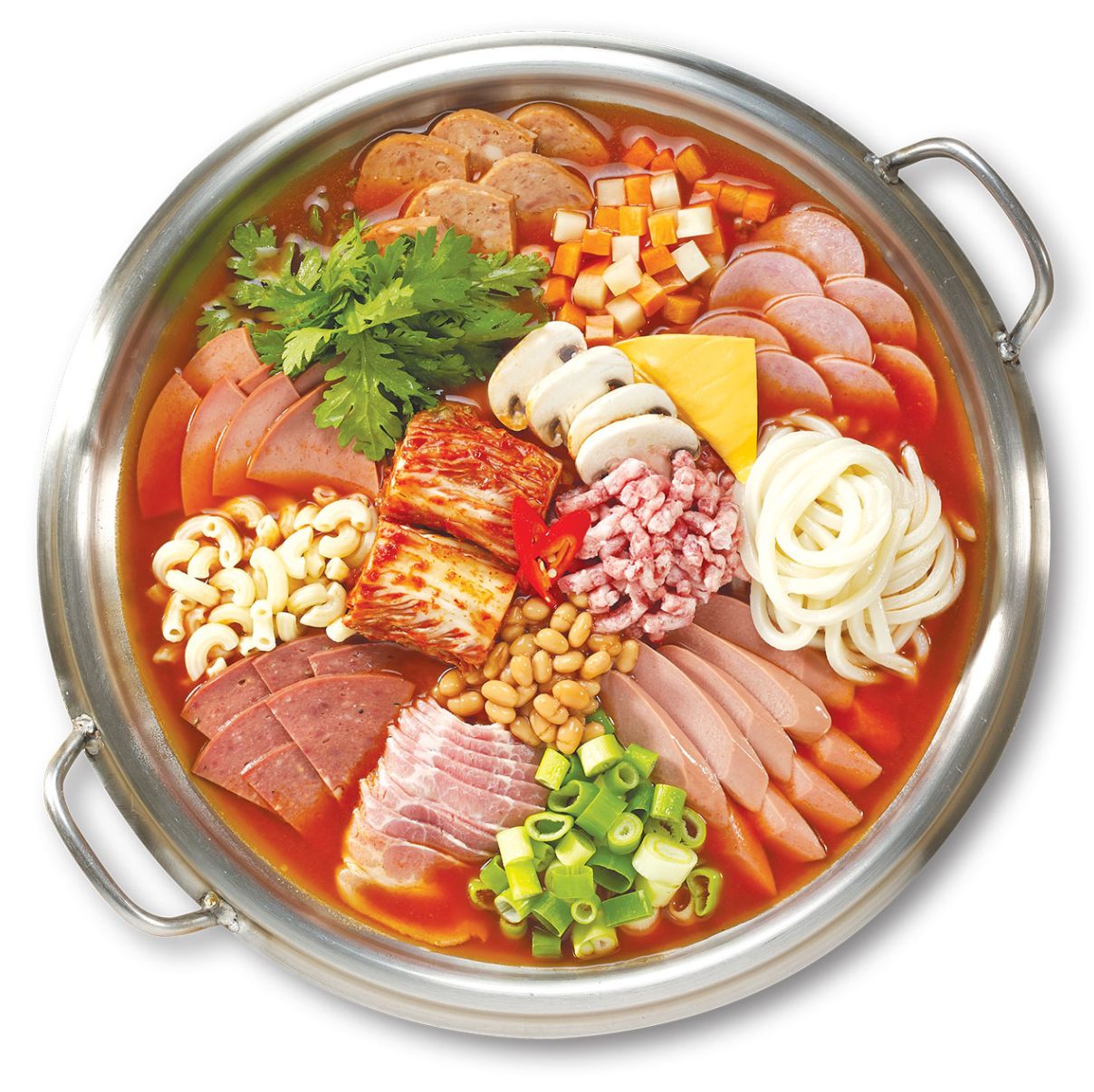 스팸 1/2통, 프랑크소세지 3개, 비엔나 소시지 10개, 베이크드 빈 3큰술, 다진 돼지고기 30g, 떡국떡 한 줌, 양배추 잎 3장, 양파 1/2개, 대파 1대, 김치 반 컵, 치즈 1~2장, 라면사리 1개, 사골육수 1봉