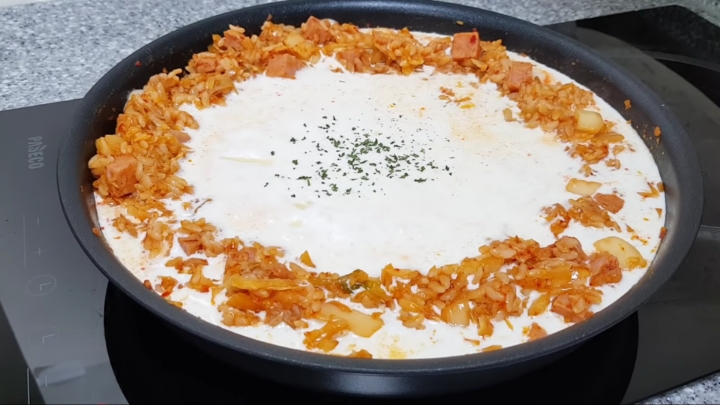 김치 양념과 밥을 넣고 볶은 다음 모차렐라 치즈 한 움큼을 뿌리고 뚜껑을 닫아 잠시 약한 불에 올려두면 밥은 살짝 눌어 꼬닥해지고, 위의 치즈는 살짝 녹아 맛있는 치즈 김치볶음밥이 됩니다.