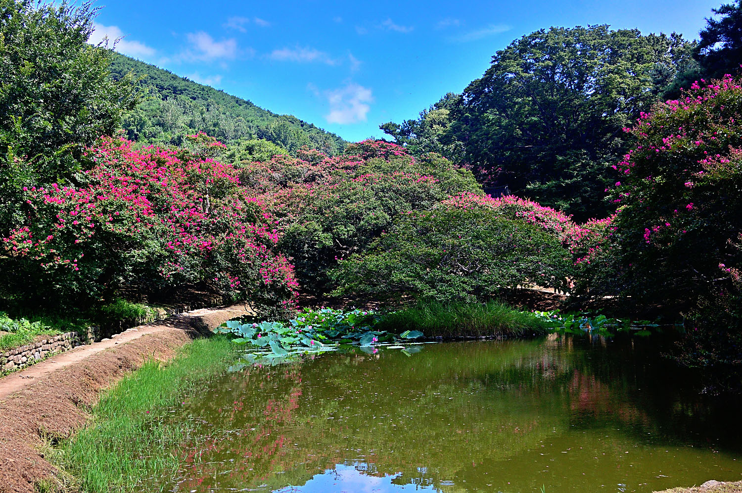 여름 담양에는 진분홍빛 향연이 펼쳐지는데 그중에 압도적인 풍광을 자랑하는 곳이 담양 명옥헌 원림으로 조선 시대 대표 민간정원이었던 곳입니다. 수령 100년이 넘은 배롱나무 20여 그루가 그림처럼 들어앉은 정자와 푸른 소나무, 붉은 꽃이 만발한 배롱나무, 정자 앞 연못이 한폭의 그림과 같습니다.
