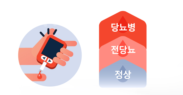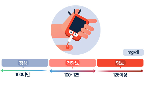 수치로 검사했을 때 당뇨병은 혈액 내 당 농도(혈당)가 8시간 이상 공복을 유지한 상태에서 126㎖/㎗ 이상이거나 금식 후 포도당을 섭취하고 2시간 후 측정한 혈당이 200㎖/㎗ 이상, 당화혈색소가 6.5% 이상일 때 당뇨병으로 간주하게 됩니다.