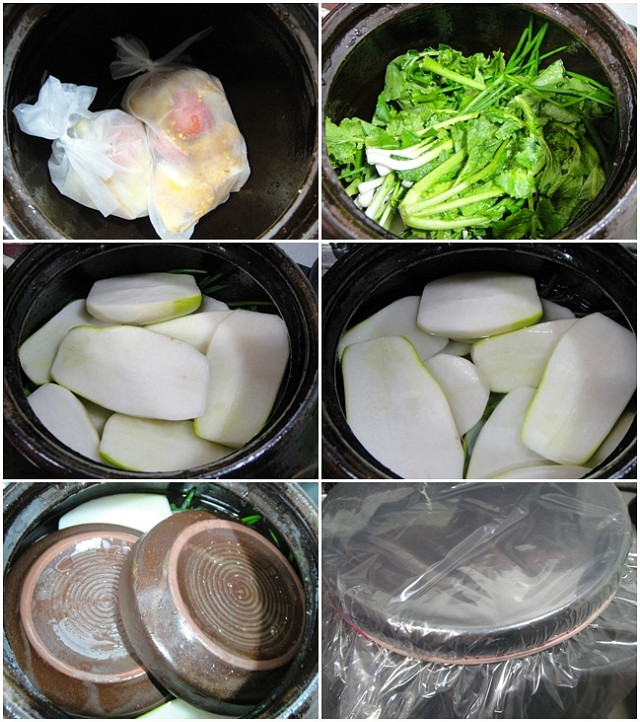 4. 항아리나 김치통 아래에 베보자기에 싼 재료들을 넣고 그 위에 절여진 쪽파, 갓, 무청, 삭힌 고추를