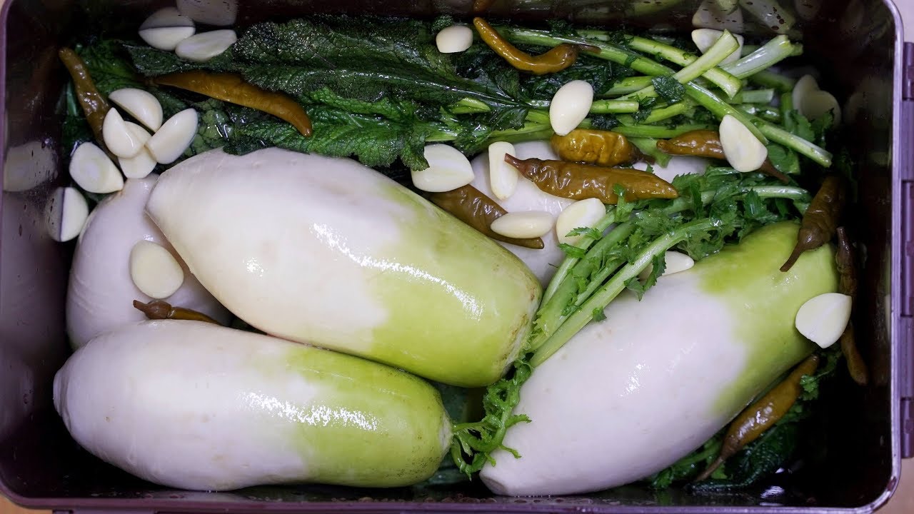 무 5개(5kg), 소금 1컵, 쪽파 한줌, 갓 한 줌, 파뿌리 5개, 삭힌 고추 100g, 청양고추 3개,