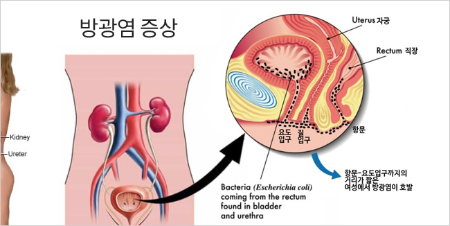 방광염 환자는 남성보다 여성에게 더 많이 발생한다고 하는데요. 이유는 해부학적으로 여성의 요도는 4cm로 남성 평균 18cm에 비해 매우 짧은 편이라 장내 세균이 회음부와 질입구에 쉽게 증식할 수 있고, 성생활과 임신을 통해 세균이 방광으로 역행하여 상행성 감염을 일으키기 쉬운 구조로 되어있기 때문 입니다.