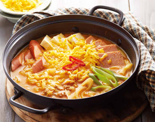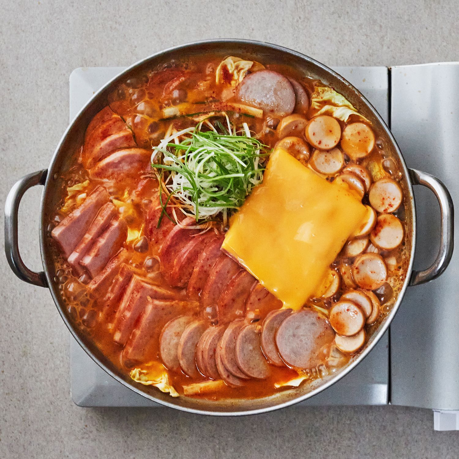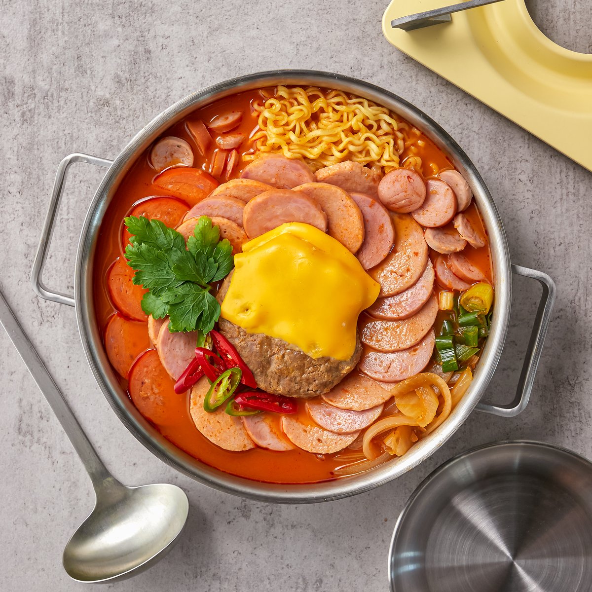 스팸 1/2통, 프랑크소세지 3개, 비엔나 소시지 10개, 베이크드 빈 3큰술, 다진 돼지고기 30g, 떡국떡 한 줌, 양배추 잎 3장, 양파 1/2개, 대파 1대, 김치 반 컵, 치즈 1~2장, 라면사리 1개, 사골육수 1봉