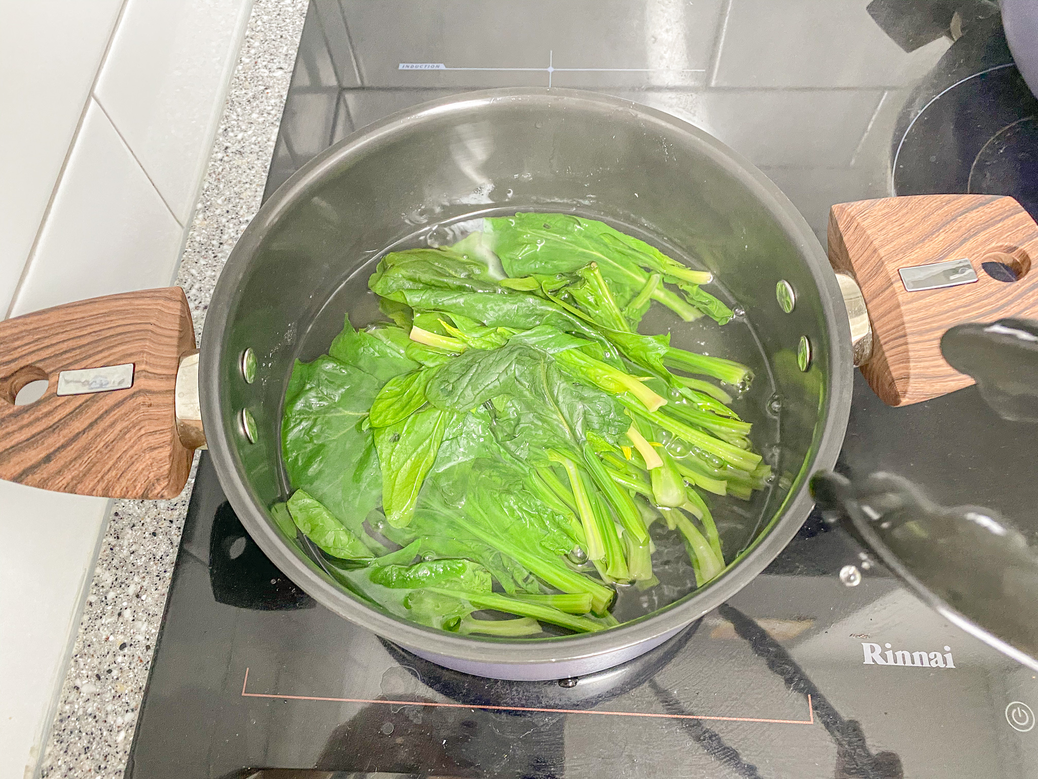 뿌리부분을 잘라내고 무른 시금치 잎은 잘라내고 흐르는 물에 씻어둡니다.