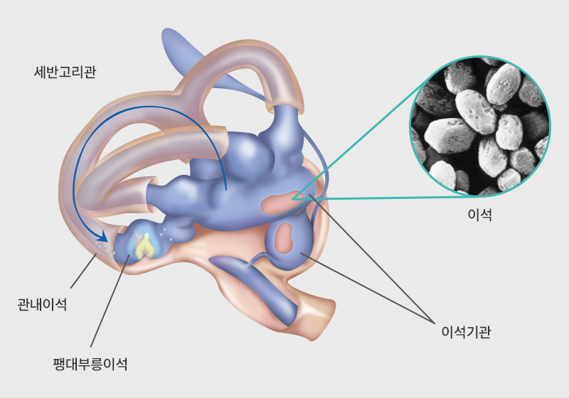 이석증은 평형 기관의 하나인 반고리관 내의 이석이 이탈하여 생기는 질환으로 머리의 움직임에 의해 유발되는 회전성 어지러움과 안진이 동반됩니다.