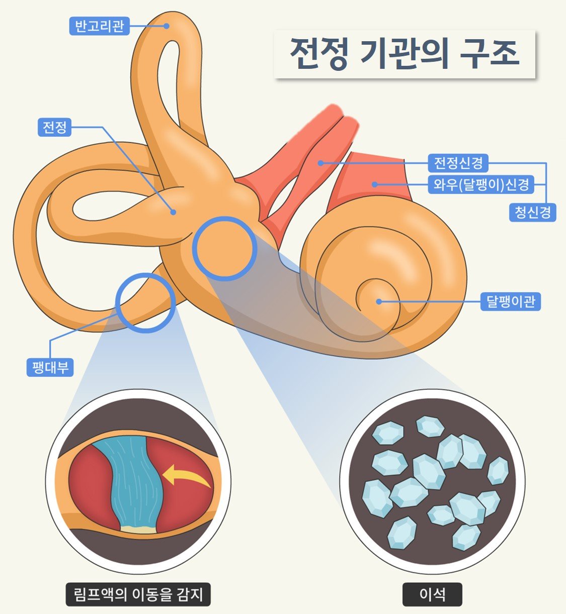 이석 기관에는 직선 감각을 느끼는 감각세포가 있는데, 머리나 몸의 움직임이 있을 때 움직여서 감각세포를 자극하는 역할을 합니다.