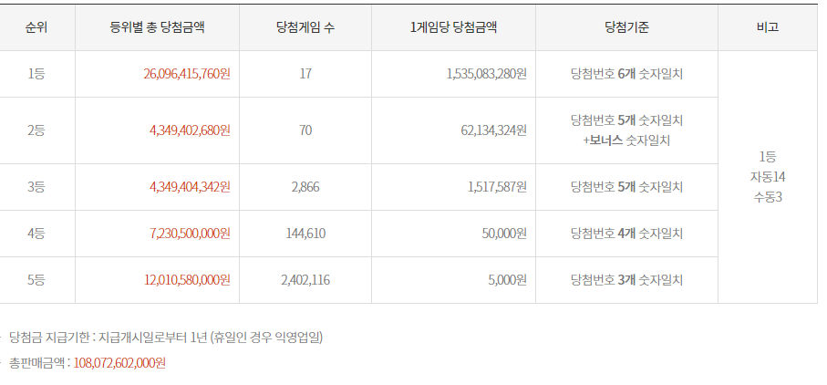 이번 주 당첨 자동/수동 당첨 수는 1등 기준 자동14, 수동 3 당첨으로 집계됐습니다.