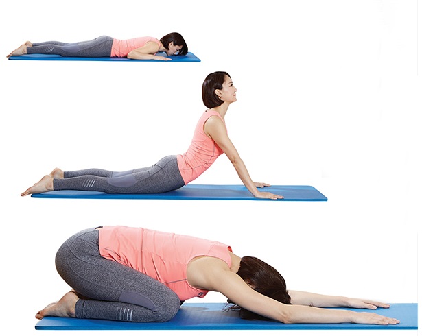 등을 풀어주는 요가 자세로 허리 외에도 목, 어깨, 등까지 상체를 길게 늘여주며 스트레칭하기 때문에 긴장된 근육을 이완시켜 뭉친 근육을 풀어주는데 효과적인 운동입니다.