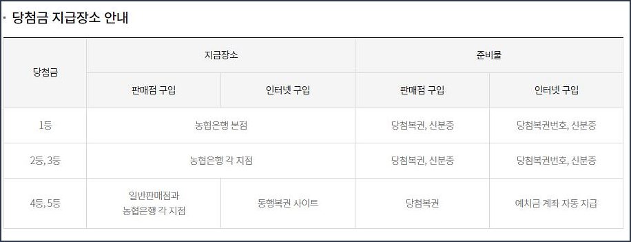 당첨금 수령 방법은 인터넷 구입 시, 1등/2등/3등이 당첨된 경우 고액당첨내역 페이지에서 실명확인 후, 복권번호와 신분증을 지참하여 NH농협은행을 방문하면 당첨금을 수령할 수 있습니다. 인터넷 구입 시, 4등과 5등이 당첨된 경우 추첨일 기준 다음날 오전 6시부터 예치금 계좌로 자동 지급됩니다. 예치금은 고객 요청에 따라 본인 명의의 금융계좌로 지급이 가능합니다. 로또 판매점에서 복권을 구매한 경우 해당 로또 판매점에 당첨된 복권을 지참하여 방문하면 됩니다. 로또 추첨시간은 매주 토요일 오후 8시 35분경 MBC방송국 스튜디오에서 생방송으로 진행되며, 추첨을 통해 로또 당첨번호가 결정되고 그 결과를 확인할 수 있습니다.