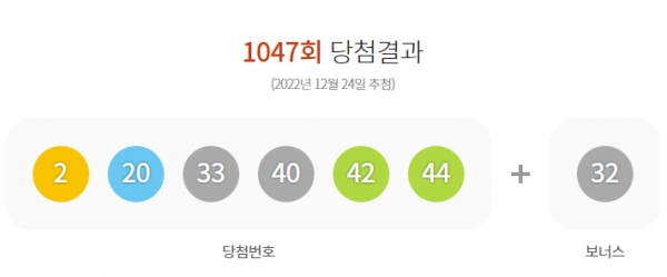 2022년 12월 24일 추첨한 1047회 로또 당첨번호는 2, 20, 33, 40, 42, 44 보너스 32로 뽑혔습니다.