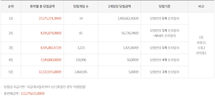 이번 주 당첨 자동/수동 당첨 수는 1등 기준 자동 11, 수동2, 반자동1 당첨으로 집계됐습니다.