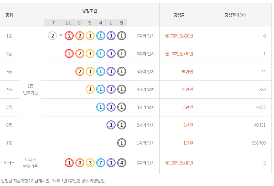 ◈ 연금 복권은 조와 자리에 맞는 숫자를 맞추어야 당첨되는 복권입니다. 1등은 20년 동안 매월 700만원, 2등은 10년 동안 매월 100만원이 주어집니다. 아래 순위에 따른 당첨 금액을 참고해 주세요.
