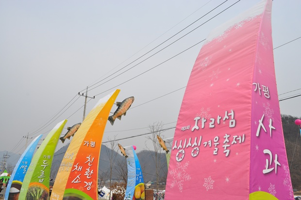 겨울이 시작되면 자라섬에는 씽씽겨울축제가 시작됩니다. 꽁꽁 얼어붙은 강 위에서 이색적인 겨울낚시를 즐길 수 있는 북한강변에 자리한 자라섬은 캠핑 시즌이 찾아오면 정말 많은 캠핑족에게 인기가 많은 곳입니다. 그리고 씽씽겨울축제가 시작되면 송어낚시, 눈썰매 등 겨울 스포츠를 만끽하기 위해 관광객이 엄청나게 찾아오는 명소입니다.