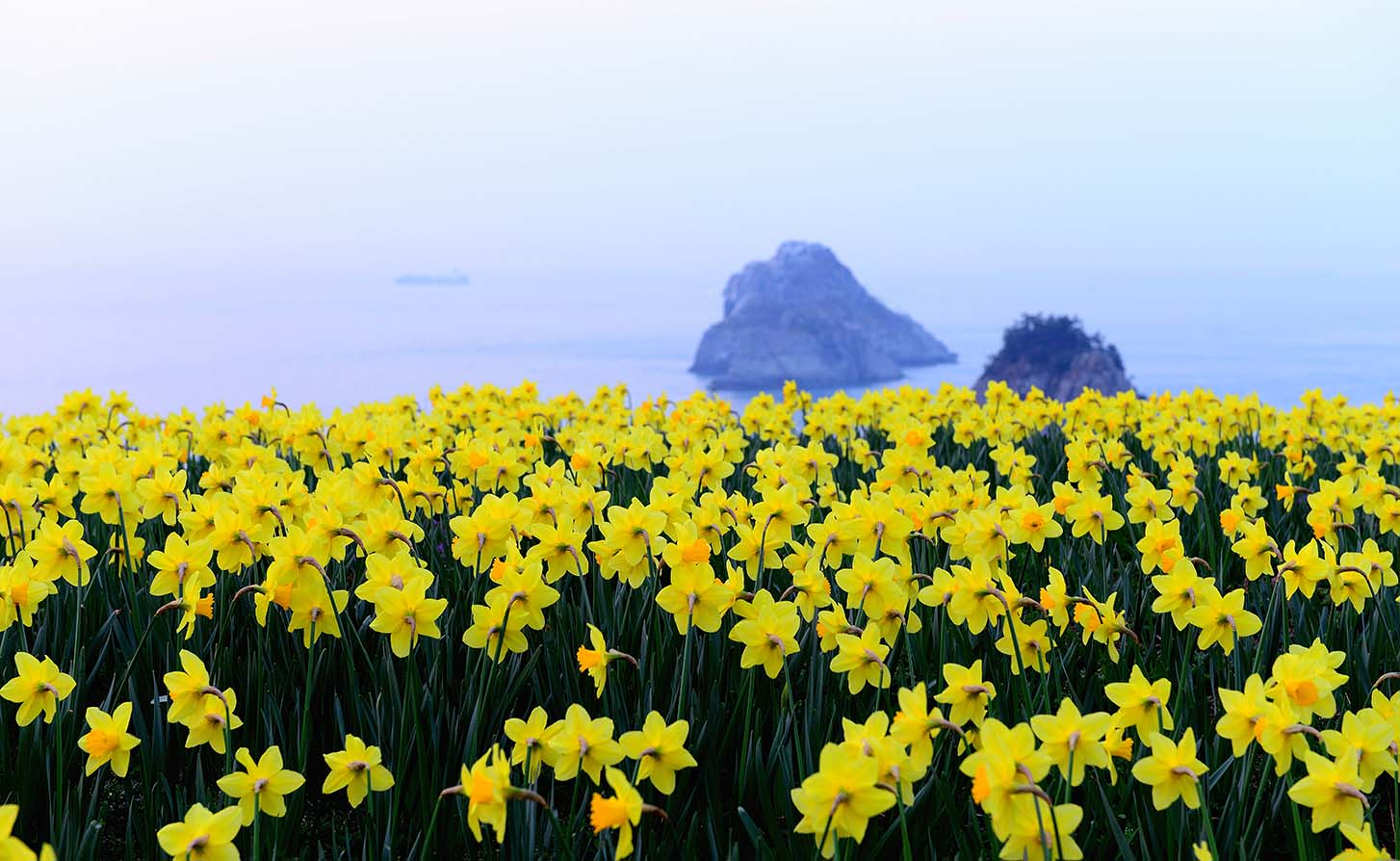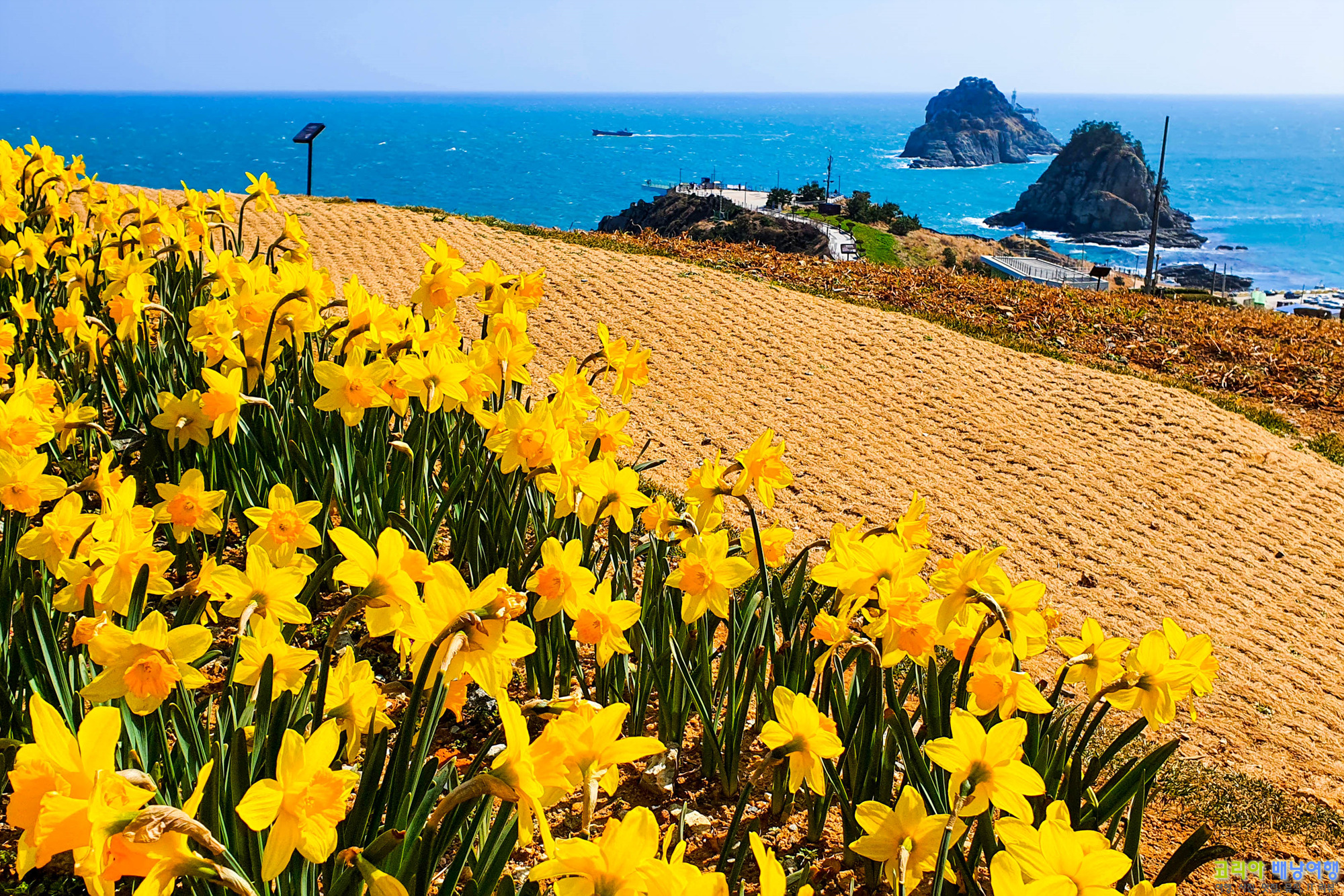 부산 오륙도 해맞이공원에서 화사한 수선화를 만날 수 있습니다. 해맞이공원은 오륙도 스카이워크 바로 옆 언덕에 위치해 있으며, 3월 말이면 노란 수선화가 만개한 아름다운 풍경을 감상할 수 있습니다.