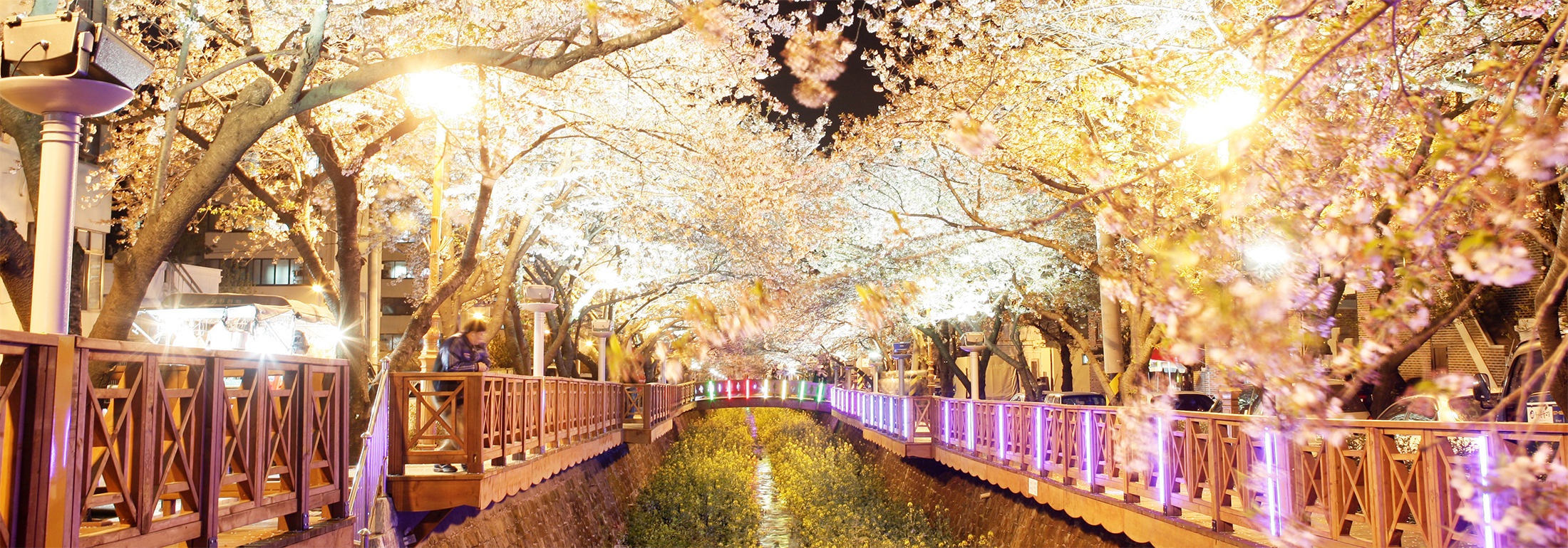 그중에서도 로망스다리로 알려진 여좌천은 1.5km 구간의 개천 양옆으로 하늘에 벚꽃 터널이 어우러져 환상적인 풍광을 만들어냅니다. 진해 군항제에는 벚꽃명소가 곳곳에 많이 있습니다.