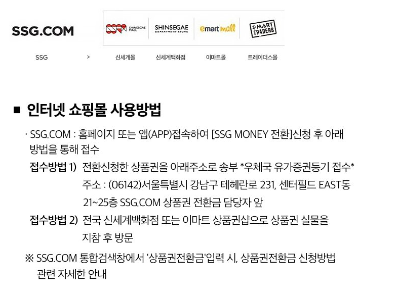 주의하실 점은 신세계상품권 중 홀로그램이 붙어 있는 상품권만 온라인으로 전환될 수 있다는 것입니다. 또한 전환된 SSG 머니를 현금교환 할 경우 상품권 전환 금액의 5%가 수수료로 차감된다는 점도 체크해 두셔야 합니다.