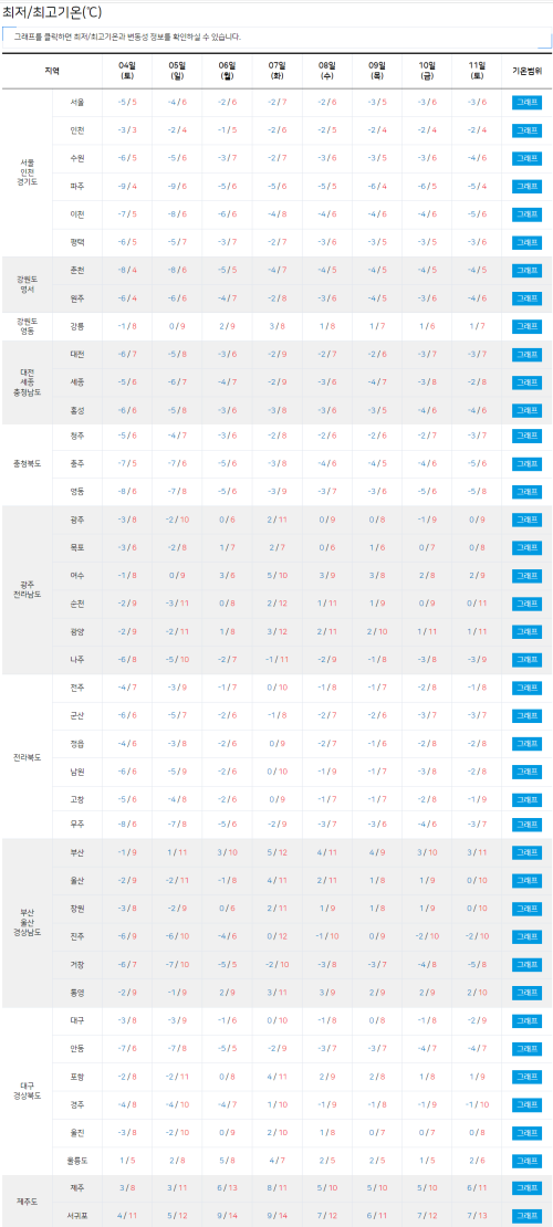 (기온) 이번 예보기간 아침 기온은 -11~-2도로 평년과 비슷하겠습니다.