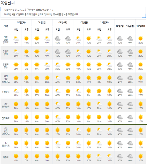 ○ (하늘상태) 이번 예보기간 전국이 가끔 구름많겠으나, 12일(일)~13일(월)은 전국이 흐리겠습니다.