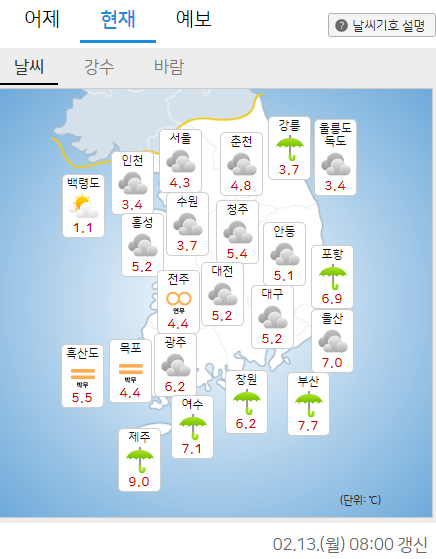 ○ 오늘(13일)은 전국이 흐리겠습니다. 내일(14일)은 전국이 가끔 구름 많겠습니다. 모레(15일)는 전국이 대체로 흐리겠습니다.