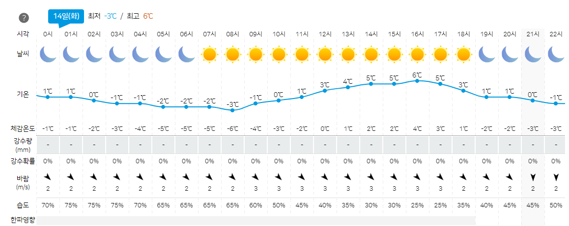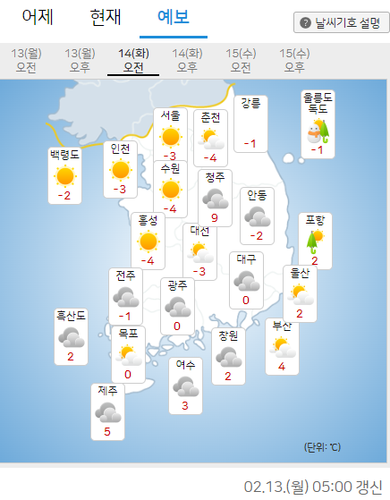 - 내일(14일) 아침최저기온은 -7~4도, 낮최고기온은 3~12도가 되겠습니다.
