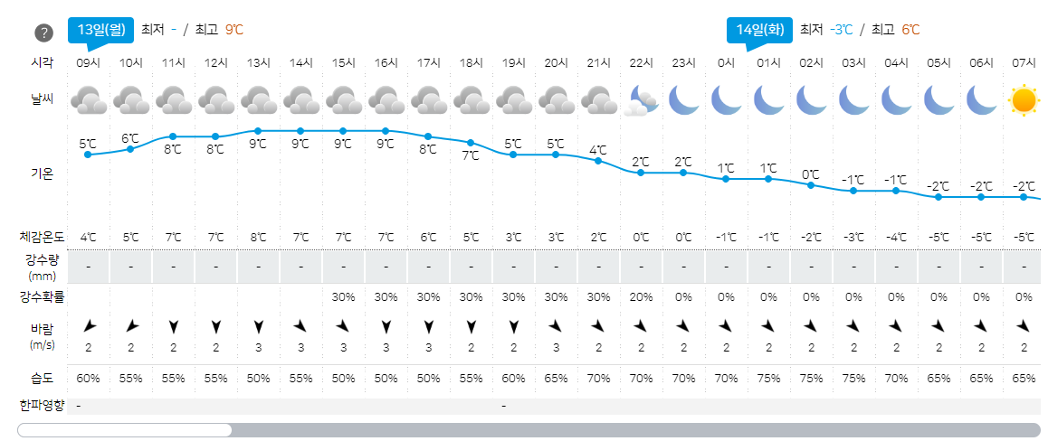 - 오늘(13일) 낮최고기온은 4~13도가 되겠습니다.