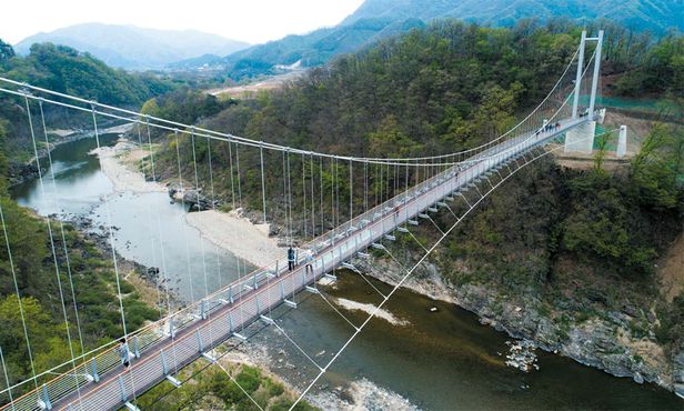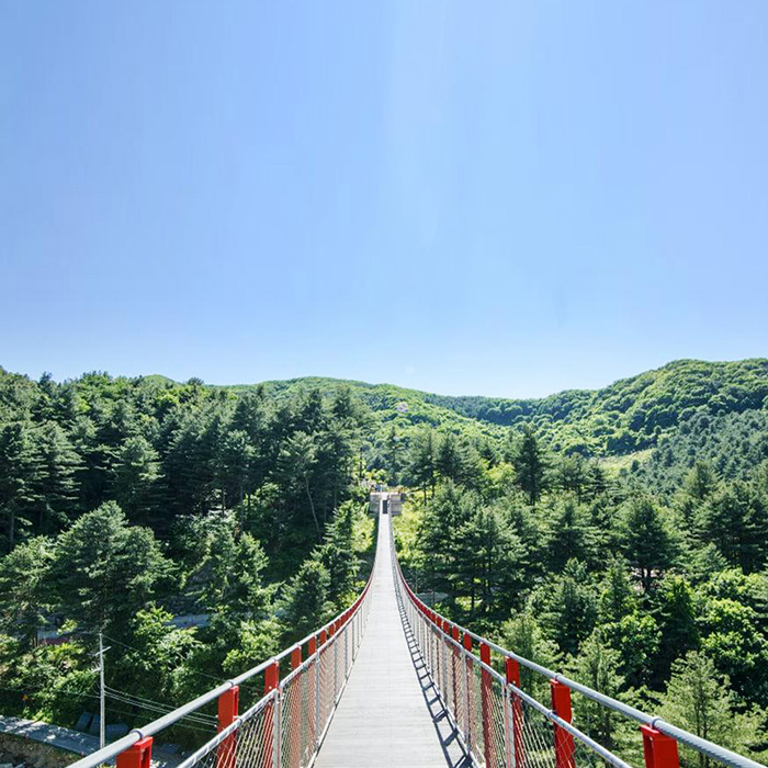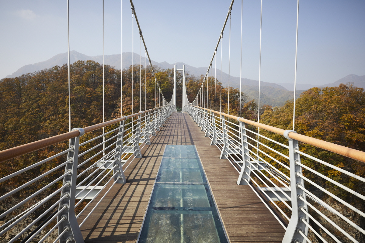 포천 한탄강 하늘다리는 길이 약 200미터 높이 약 50미터로 아파트 약 15층 정도의 높은 높이를 걸어갈 수 있는 흔들 다리입니다. 하늘다리 중간에서 내려다보는 한탄강의 모습은 정말 아름답습니다. 특히 한탄강은 국내 유일의 현무암 침식 하천으로 한국의 그랜드 캐니언이라고도 알려져 있으며 주상절리 협곡의 모습은 감탄을 자아내기 충분합니다. 다리 중간에는 발아래로 투명 강화 유리가 있어서 스릴 만점입니다. 비둘기낭 폭포와 같이 있기 때문에 같이 보시면 되는 코스입니다.