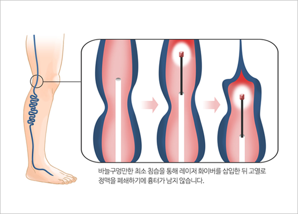 정맥 내로 레이저를 발산하여 병든 정맥을 유착시켜서 혈액흐름을 차단하는 방법이지만 모든 정맥류에서 적용되지는 않습니다.
