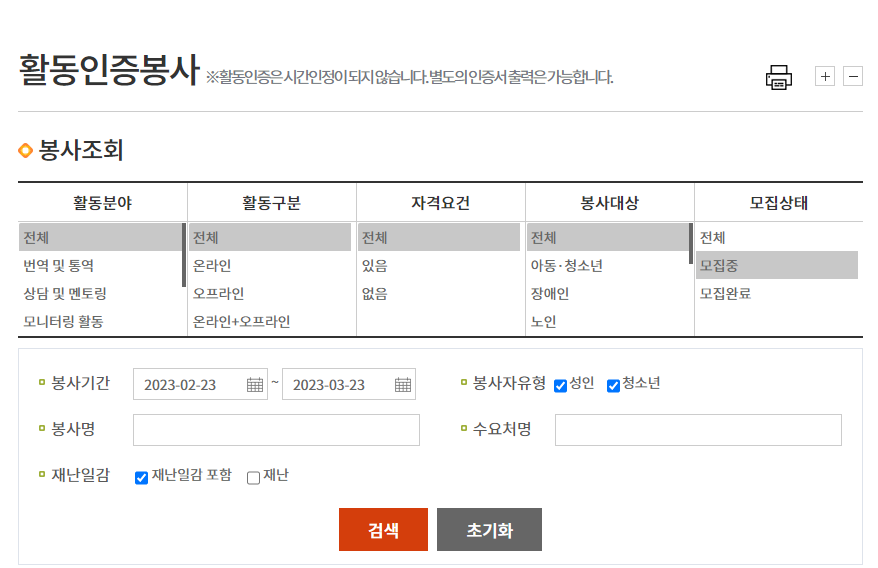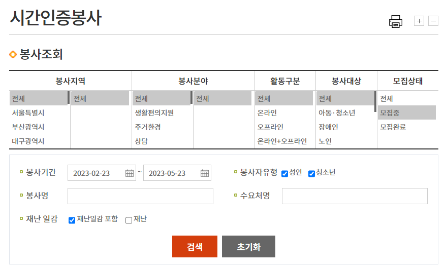 3. 지역, 분야, 기간 등 나의 상황과 조건에 매치되는 자원봉사가 있는지 조회