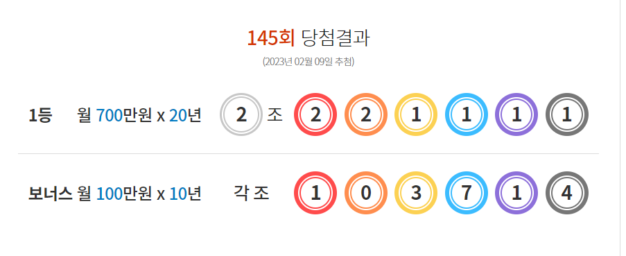 2023년 2월 9일 목요일 추첨한 제 145회 연금복권720 당첨결과가 나왔습니다.